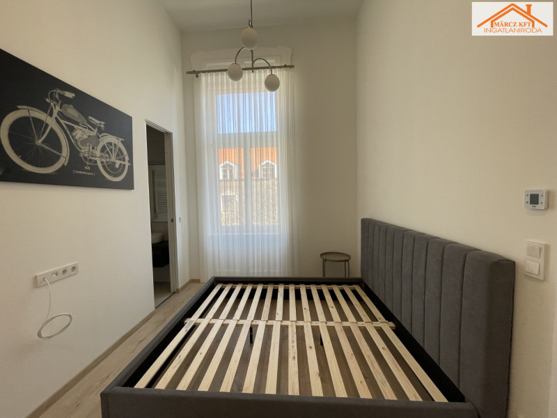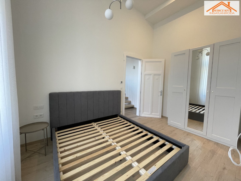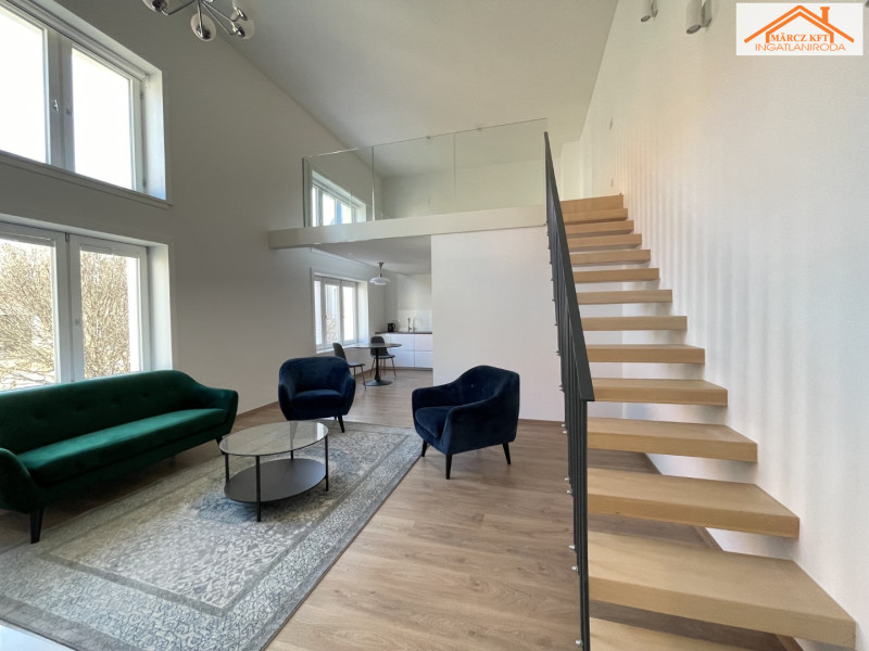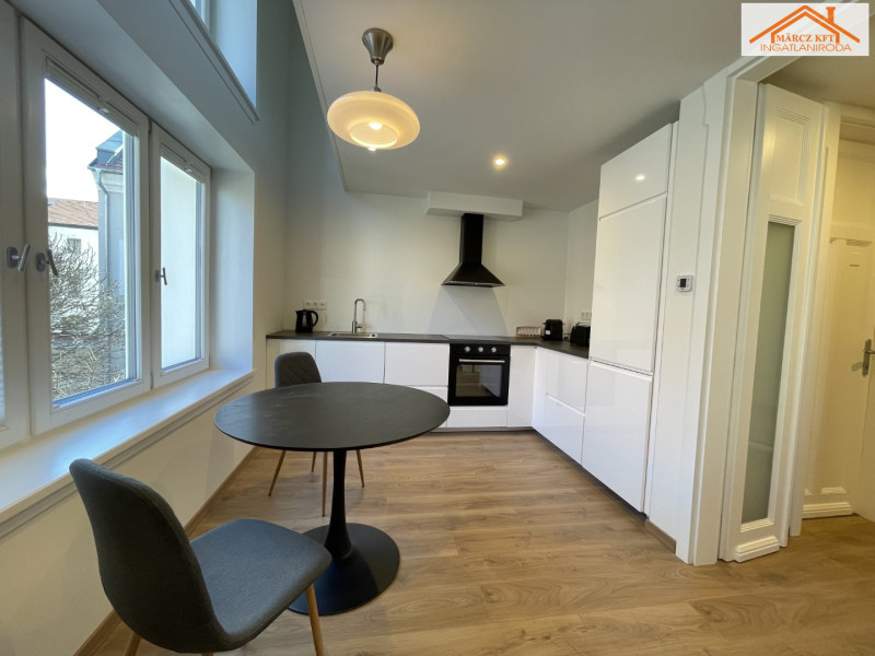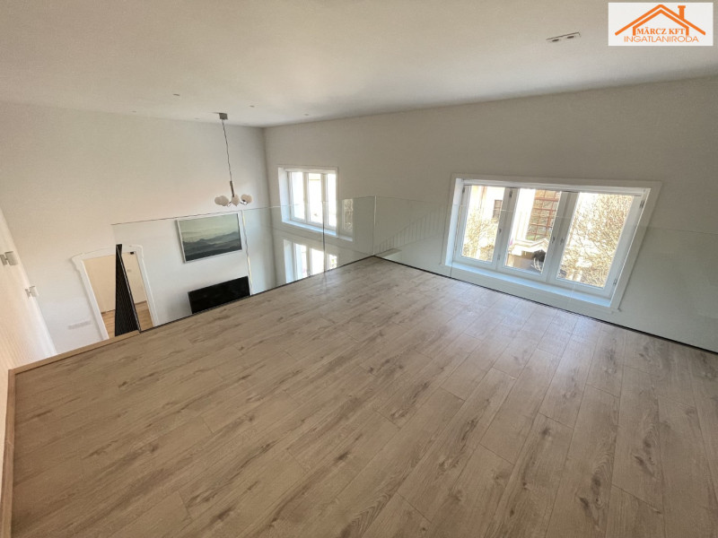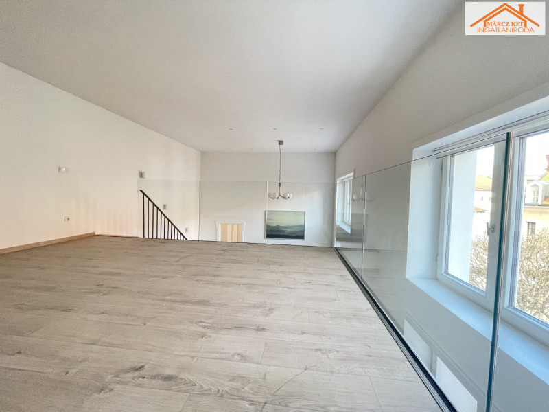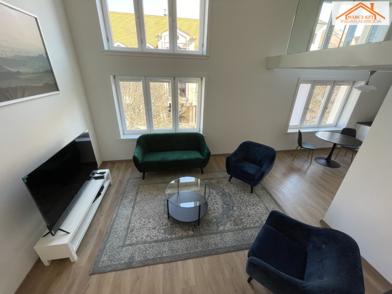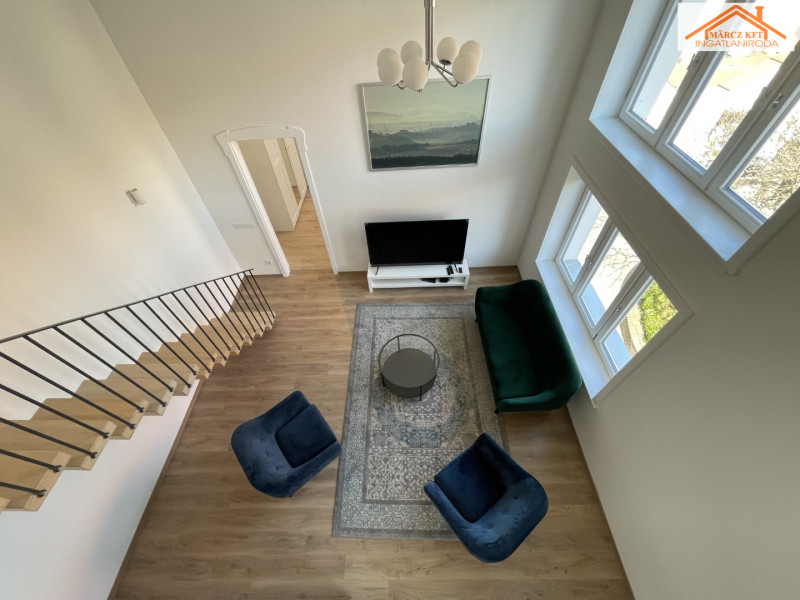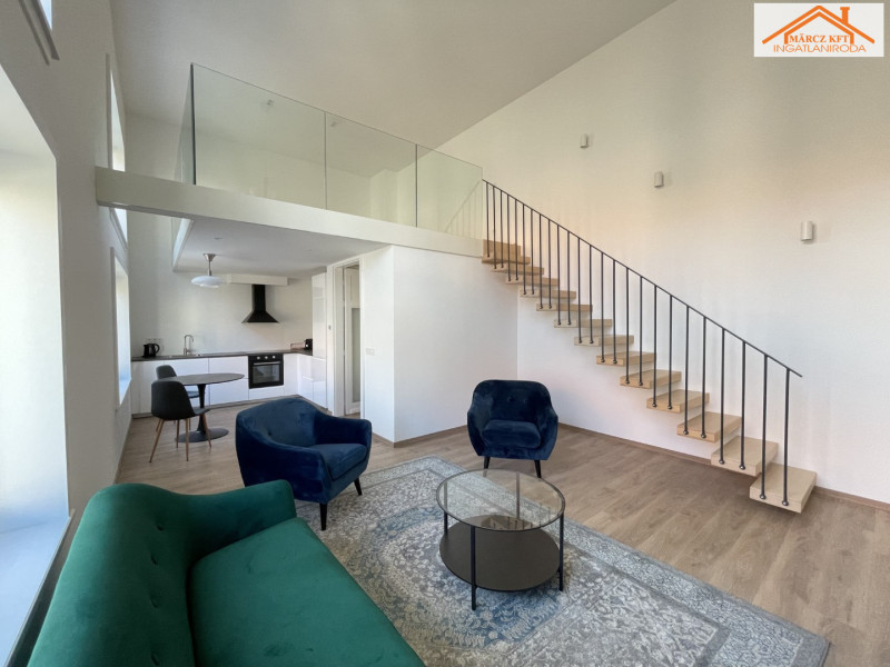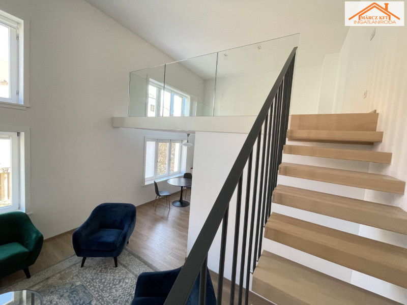 BL-003590. Történelmi belvárosban, csendes környezetben, 1 emeleti, modern, újszerű 73 m2 nagyságú, amerikai konyhás nappali + 1 szobás + galériás, teljesen gépesített lakás hosszútávra kiadó 2025.10.01 től.