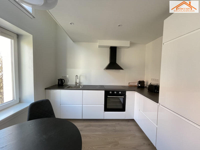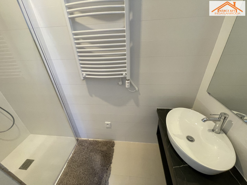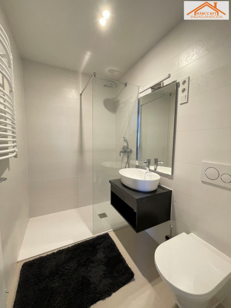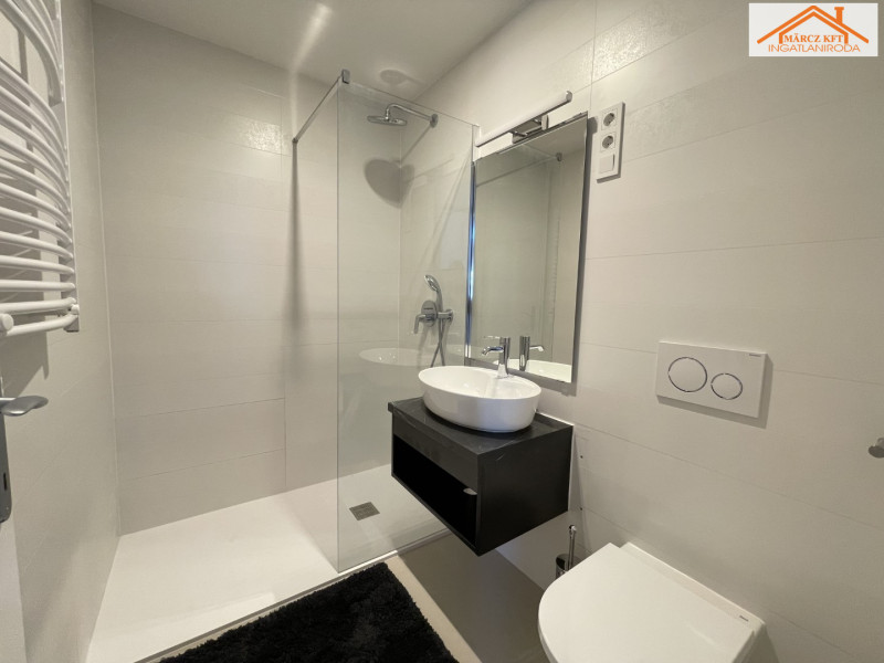 A fürdő és a wc, egy helységben található. A fűtésről – hűtésről és a melegvíz előállításról korszerű, modern, föld – víz hőszivattyú gondoskodik, padló – fal – mennyezeten keresztüli hőleadással. Az épület tetején elhelyezett napelemeknek köszönhetően a lakás rezsi költsége nagyon kedvező. A belső udvarról, akadálymentesen, lifttel közelíthető meg. A konyha modern gépekkel felszerelt. Parkolás fizetős övezetben és behajtási engedéllyel megoldható, fedett beálló bérlésére is van lehetőség a közelben található parkolóházban. A földszinten közös bicikli és babakocsi tároló került kialakításra. A közelben megtalálhatók kisebb boltok, éttermek, kávézók, és számos egyéb más szolgáltatók is. Autóbusz állomás 5 perc séta távolságra elérhető. Dohányzás és háziállat tartása nem megengedett. A lakás kialakításából adódóan 1-2 fő részére, családnak biztosít kényelmes és komfortos lakhatást.