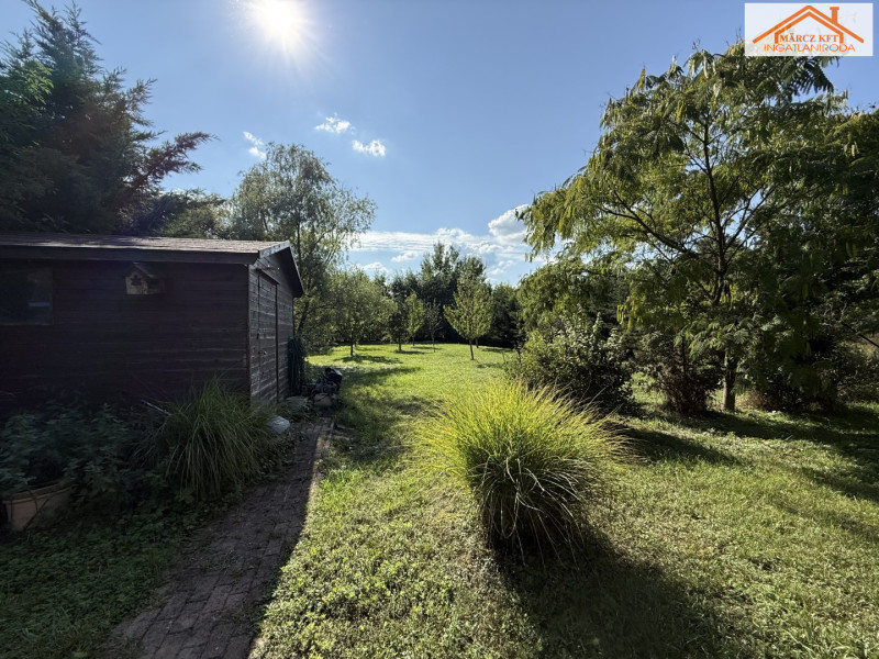 Az utcai kapu elektromosan nyitható, az udvar térkövezett, parkosított. Itt található egy fedett terasz illetve a kertben egy tároló. A kertben, szerszámtároló számos gyümölcsfa, magaságyás, örökzöld megtalálható.