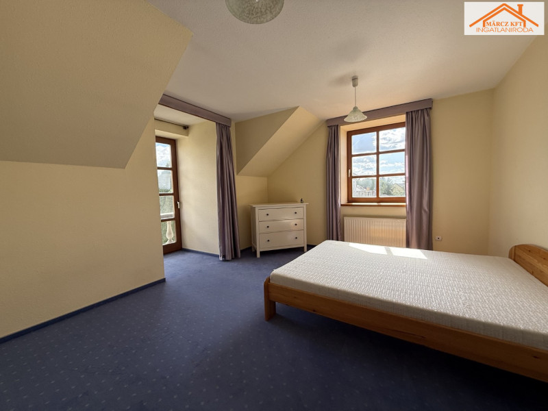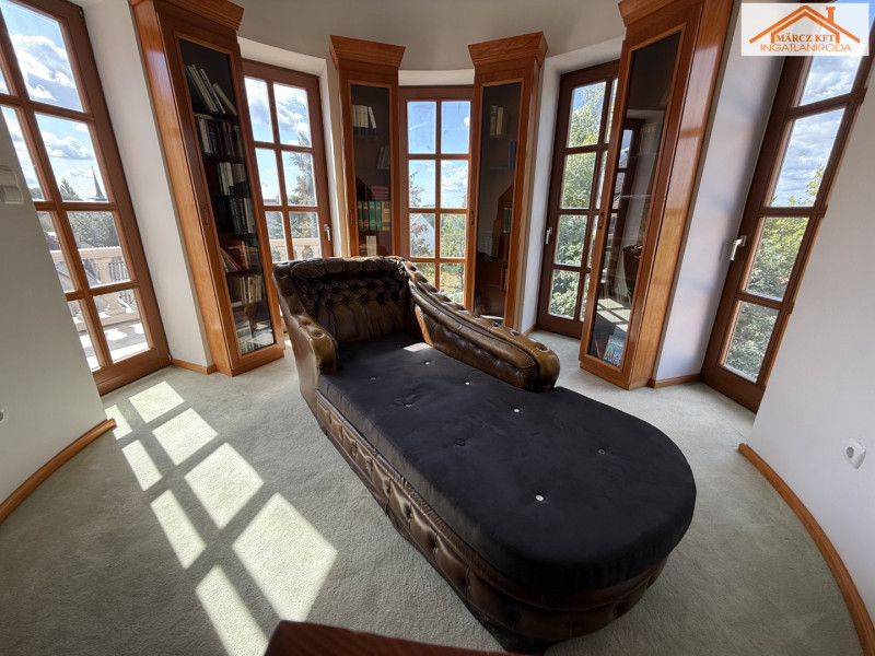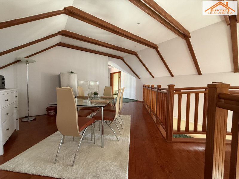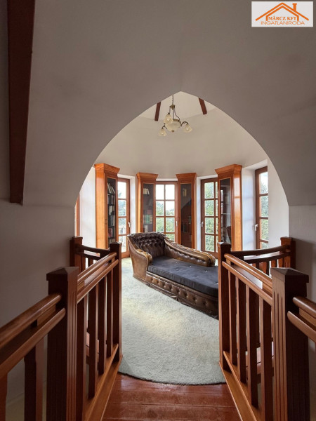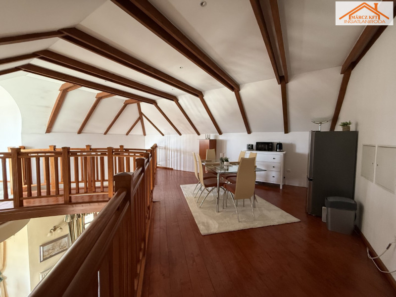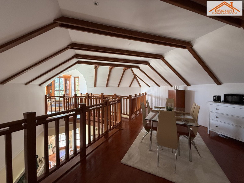Tetőtér (138m2): A lépcsőházon keresztül közelíthető meg. Az épület utcai szárnyában helyezkednek el a hálószobák, három szoba a nappali, és a fürdőszoba. A nappali felett galéria készült dolgozósarokkal, amelyet híd köt össze a torony tetőtéri szintjével, ahol olvasóhelyiség lett kialakítva. A földszinti déli terasz felett erkély készült, amire a toronyból lehet kijutni.