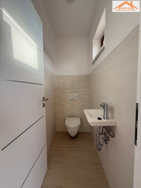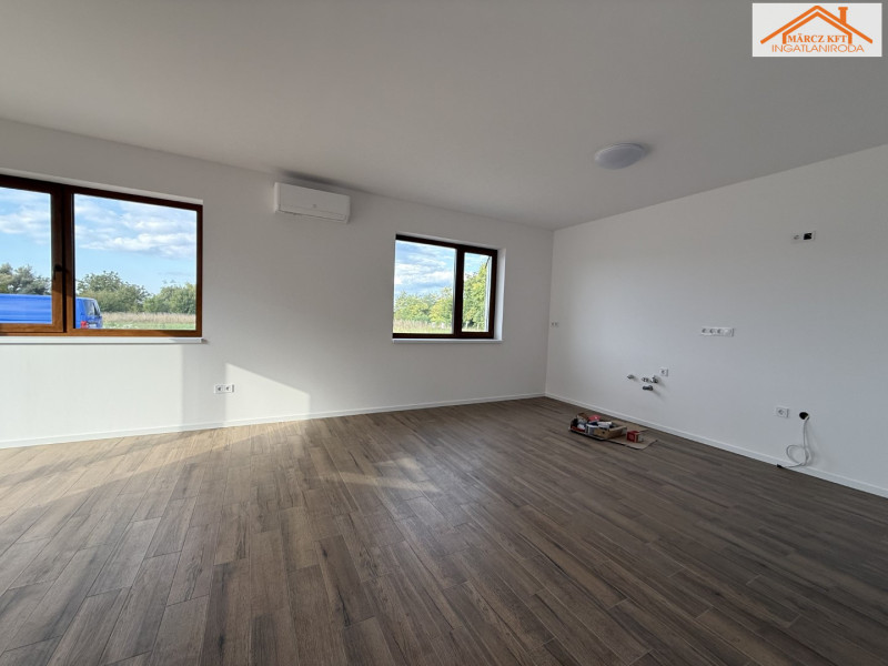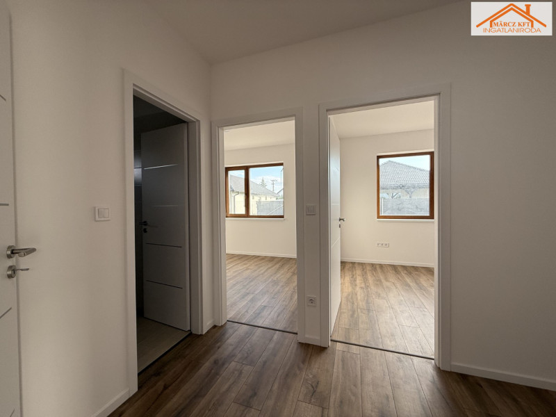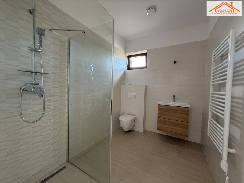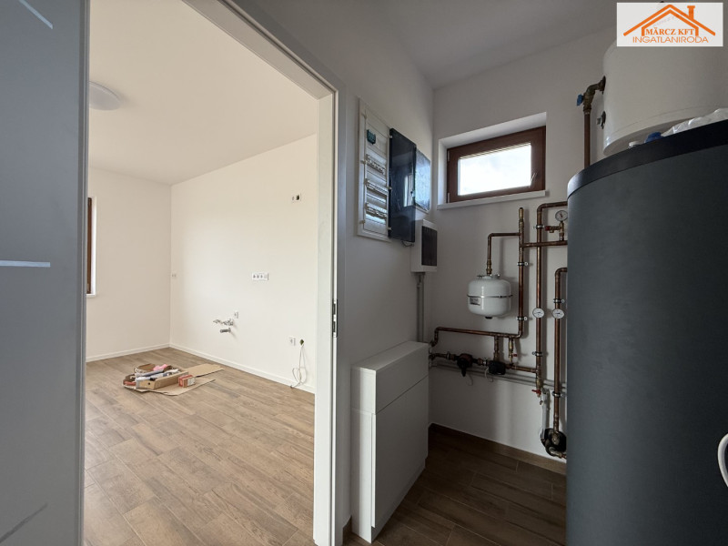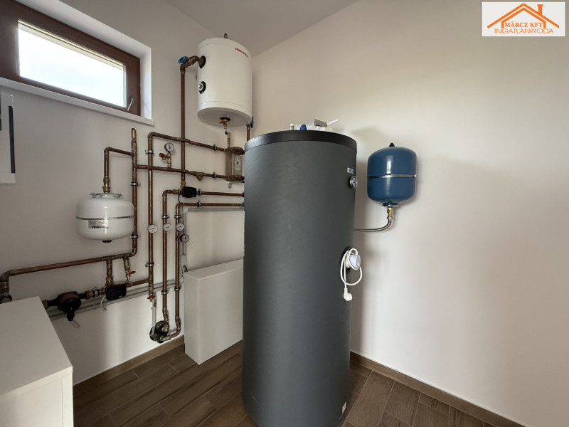 A nyílászárók műanyagból készültek,3 rétegű hőszigetelt üvegezéssel, rejtett redőny tokkal. A burkolatok magas minőségű járólap, illetve laminált padló. Fűtése-melegvíz: hőszivattyú megoldással, padlófűtéssel.