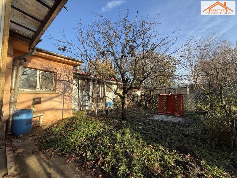 A telek körbekerített, található még egy garázs, és kb 40m2 melléképület. Az ingatlan az egyik utcafrontról személyi bejárattal rendelkezik, a másik oldalon gépkocsi bejárat és a garázs. Az udvar hátsó részén gazdasági épületek gyümölcsfák és veteményes található.
