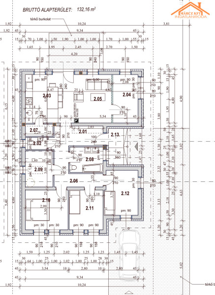 A ház elosztását tekintve: Amerikaikonyhás nappali +kamra, 4 egész szoba, praktikusság miatt fő szempont volt, az élhető terek kialakítása is ezért 9,5-12 m2 nagyságú hálószobák készülnek, továbbá fürdőszoba kialakításra kerül wc-vel ellátva, valamint vendég wc, háztartási helyiség, terasz