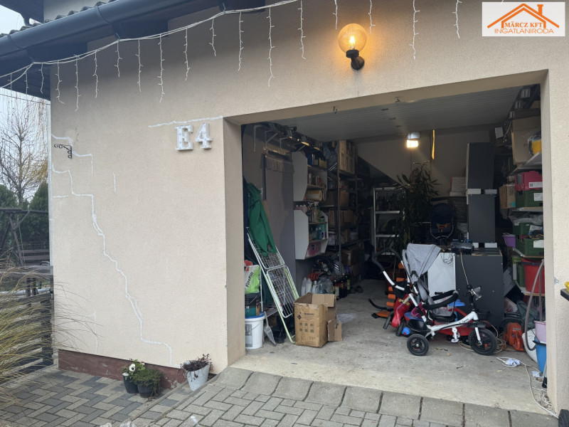 Az alsó szinten előszoba, amerikai konyhás nappali, kamra, WC és elektromos kapuval ellátott garázs található.